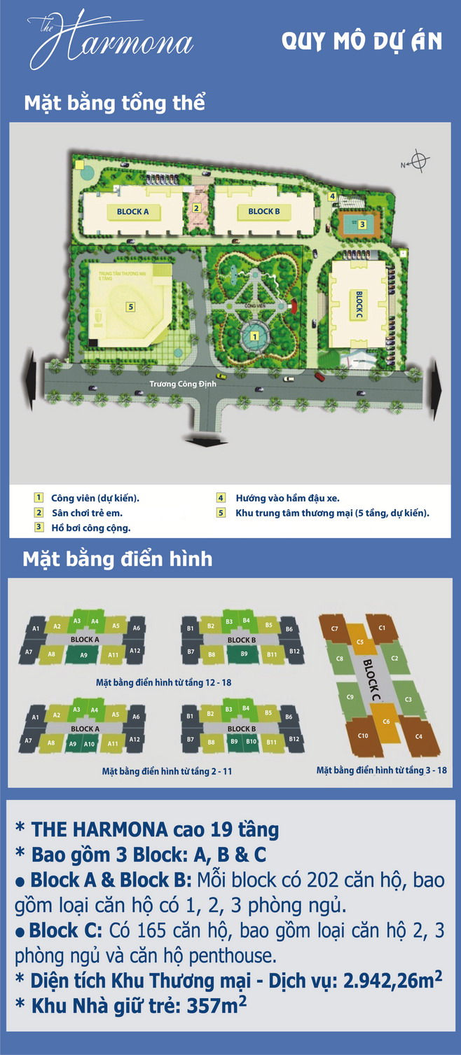 The Harmona có 3 block cao 19 tầng với 537 căn hộ lớn nhỏ, có diện tích dao động 50 m2, 72,4 m2, 80,2 m2 cho đến 96,5 m2. Tầng trệt và lửng dành cho khu thương mại. căn hộ the harmona Đặc biệt các penthouse tầng trên cùng sẽ là những “biệt thự trên cao”có sân vườn, hồ bơi, cây xanh. Mỗi penthouse có diện tích từ 149 đến 96 m2. Tất cả phòng khách, ngủ, bếp, sân phơi, hành lang liên thông, sảnh, thang máy, thang bộ của toàn bộ các căn hộ đều đón gió, nắng, ánh sáng thiên nhiên và góc nhìn tầm mắt là màu xanh và không gian rộng mở…